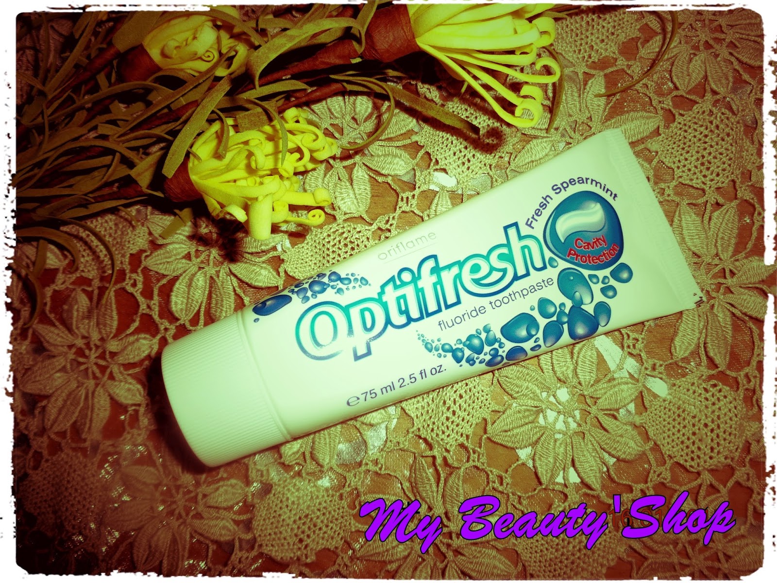Pasta de Dentes da Gama Optifresh (indicada para a protecção de cáries) com menta fresca.